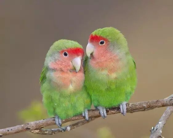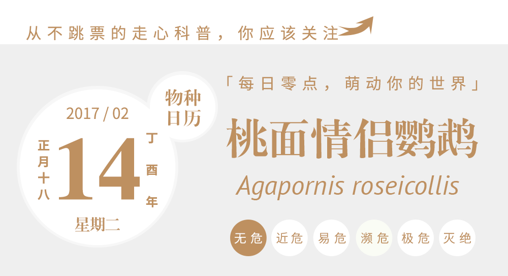 桃脸情侣鹦鹉Agapornis roseicollis从学名到各种语言中的俗名都和爱情有关,情侣鹦鹉属Agapornis就来自希腊语agape(爱)+ornis(鸟),英语中把这种鸟简单粗暴地叫做lovebird,因为它是典型的单偶制动物,一旦结成伴侣基本上终生不分离。
