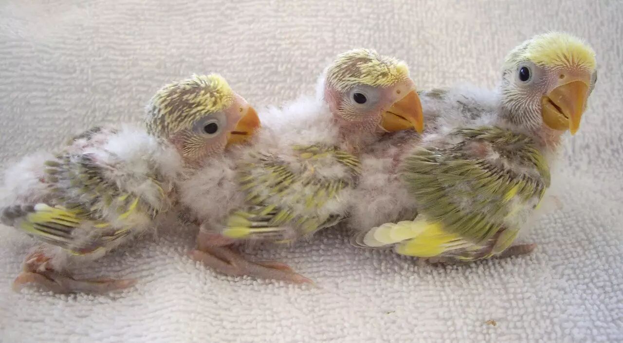 蛋的孵化工作全程都由雌鸟完成,雄鸟在巢外面负责警戒和给雌鸟喂食。和其他鹦鹉一样,桃脸情侣鹦鹉的雏鸟也属于晚成雏,刚出壳时浑身光秃秃的没几根毛,眼睛也没睁开,亲鸟喂养大概两周后才能够独立生活,如果出现亲生父母不饲喂雏鸟的现象,也可以人工喂食。桃脸情侣鹦鹉是一种很聪明的鸟,从小就接触主人的话可以变得很亲人,当然平时也要经常陪它玩耍才好。