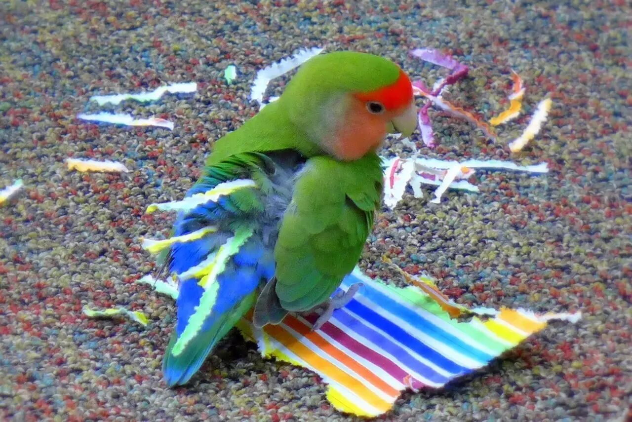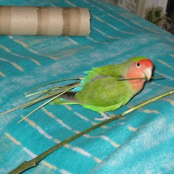 如果是人工饲养环境中,往往还会撕纸条如法炮制,这种行为是桃脸情侣鹦鹉独有的,其他情侣鹦鹉都不会。