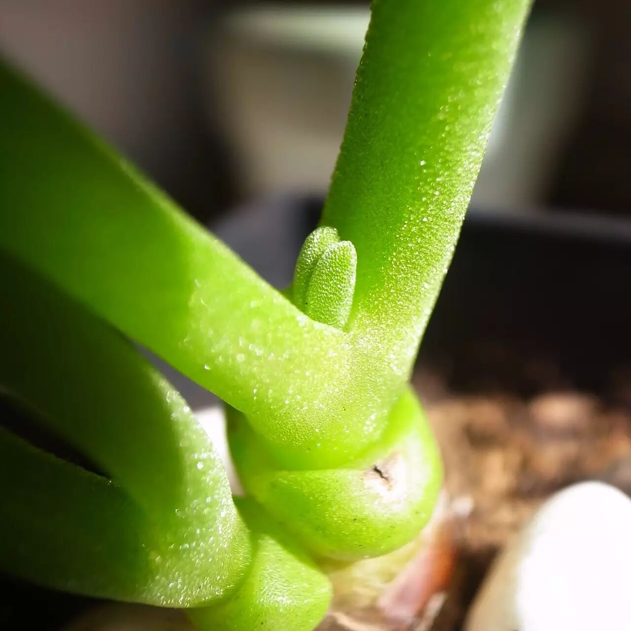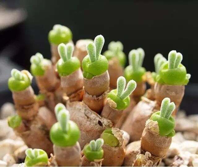 休眠时期的碧光环对水分需求极小,水多容易整体腐烂,所以这时候千万不要好心办坏事,觉得人家快干死了,得浇水。夏天养护碧光环对新手来说的确是个考验,除了断水之外,还要适当遮阴,最重要是调整好心态。过了秋天,小兔子会重新从茎段顶部探出头来,报答你这一夏的照料。