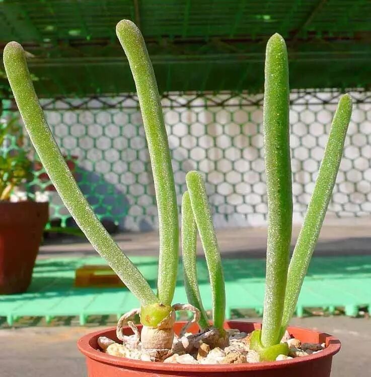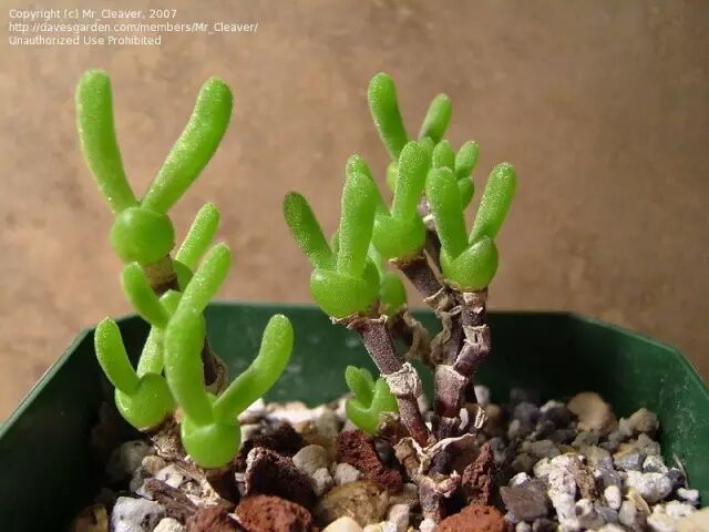 枝干番杏具有较细的黑褐色带节茎段,多分枝,通常木质化,在南非原产地容易长成小灌木样子。它们具有形态不同的分叉对生叶,或长如兔耳,或短如糖豆,同样炒鸡萌,颇受小女生欢迎。