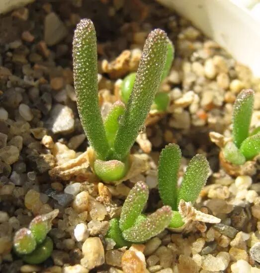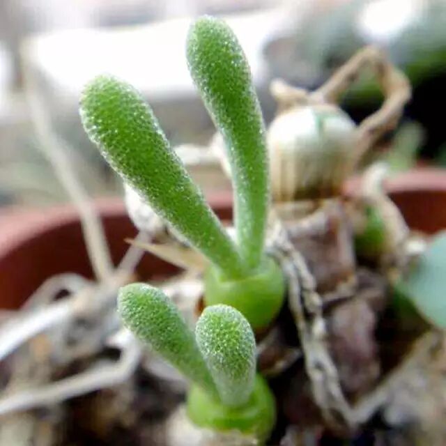 很多肉友会把碧光环和枝干番杏混淆在一起,大抵是因为两者都有萌萌哒兔子造型的茎叶,其实,它们是不同的番杏科植物。枝干番杏是春芽草属Dicrocaulon的一类多肉统称,大概有十来种。属名来自希腊语,dicros意为“叉子”,caulon“分段”。