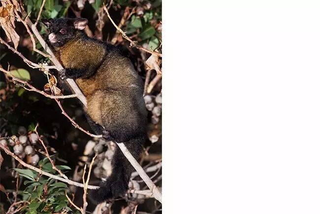 普通帚尾袋貂有些像一只长了尾巴的小号考拉。作为一种主要吃桉树叶子的动物,它们扫帚一样的大毛尾巴腹侧是没毛的,可以抓握住树枝。另外它们的后爪拇指可以对握,也有助于爬树。