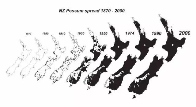 从1870年到2000年,普通帚尾袋貂在新西兰的扩散过程。图片:Wikipedia