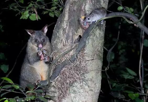 嘿嘿嘿嘿……谁说我只能吃鸟蛋?帚尾袋貂吃幼鸟,右上是老鼠,也来吃个夜宵。深夜灭门惨案啊。另外,夜间半瞎的成鸟它们也不会放过的。图片:doc.govt.nz