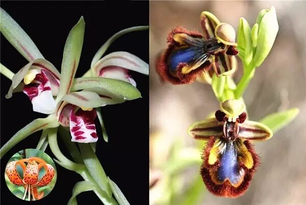 左图:花瓣上的斑点,在蜜蜂等昆虫吃货看来,就代表有花蜜可食,蕙兰等兰科植物就习得这种伎俩勾引昆虫义务劳动。右图:角蜂眉兰将花朵伪装成雌性胡蜂,甚至连胡蜂身上的根根绒毛都在花瓣上伪装了出来。图片:epicphals、lvanmoan/flickr