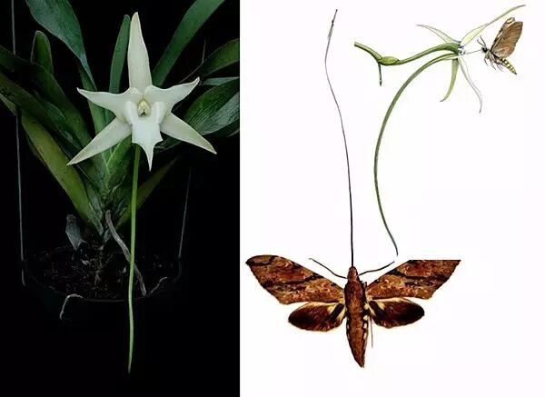 在植物和传粉者的组合中,最有名的一对当属大彗星风兰(Angraecum sesquipedale)和非洲长喙天蛾(Xanthopan morganii praedicta)。1862年,达尔文在其《兰花的传粉》一书中,推测应该有一种口器为20cm的昆虫,为这种距长达20cm的兰花传粉。这一推论当时无人相信,直到1903年,人们才发现并观察到这种为其传粉的天蛾,印证了达尔文的推测。