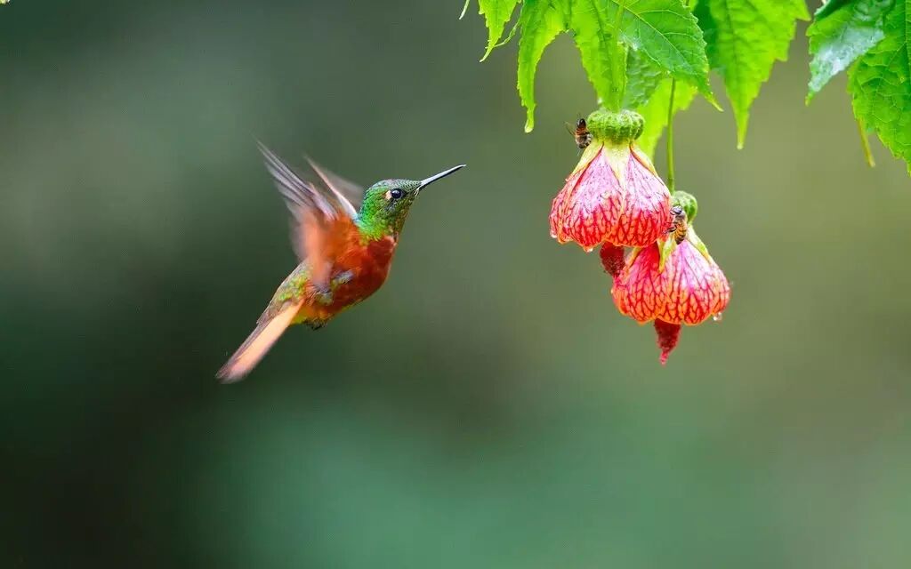 一只栗胸冕蜂鸟飞向了金铃花。图片:Wang Hc/flickr