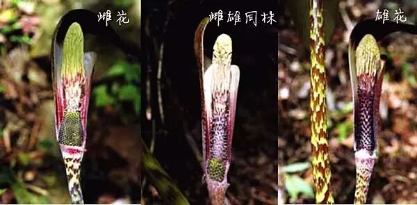 蓬莱天南星雌花、雄花、雌雄同株的三种形态,其性别转换之飘逸,可见一斑。图片来自作者