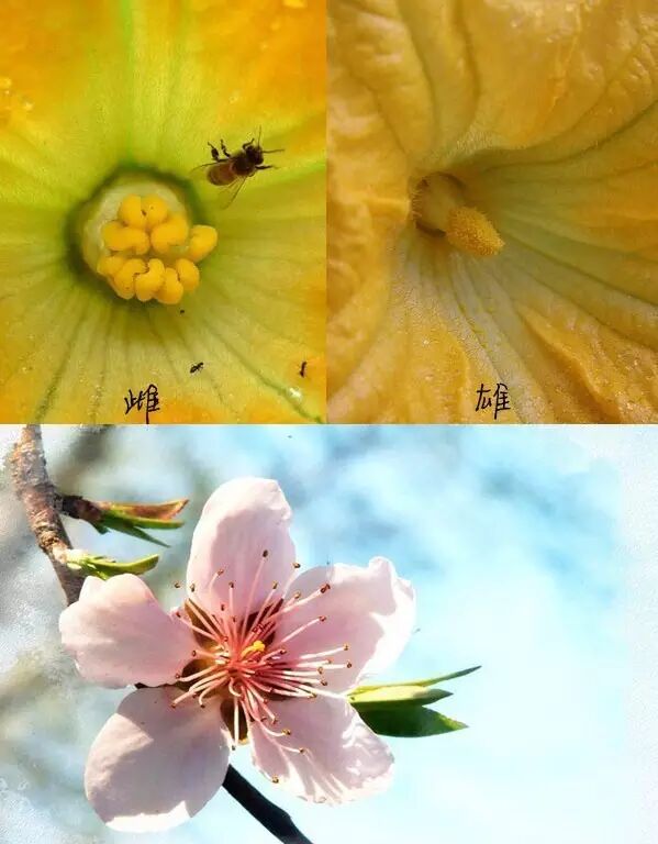 南瓜(Cucurbita moschata (Duch. ex Lam.) Duch. ex Poiret)本身是单性花,雌雄蕊分别在不同的花里,但雌性花与雄性花长在同一植株上;而桃花(Amygdalus persica)则为两性花,雌雄蕊理所当然的长在同一植株上。图片:Sara Steger/flickr