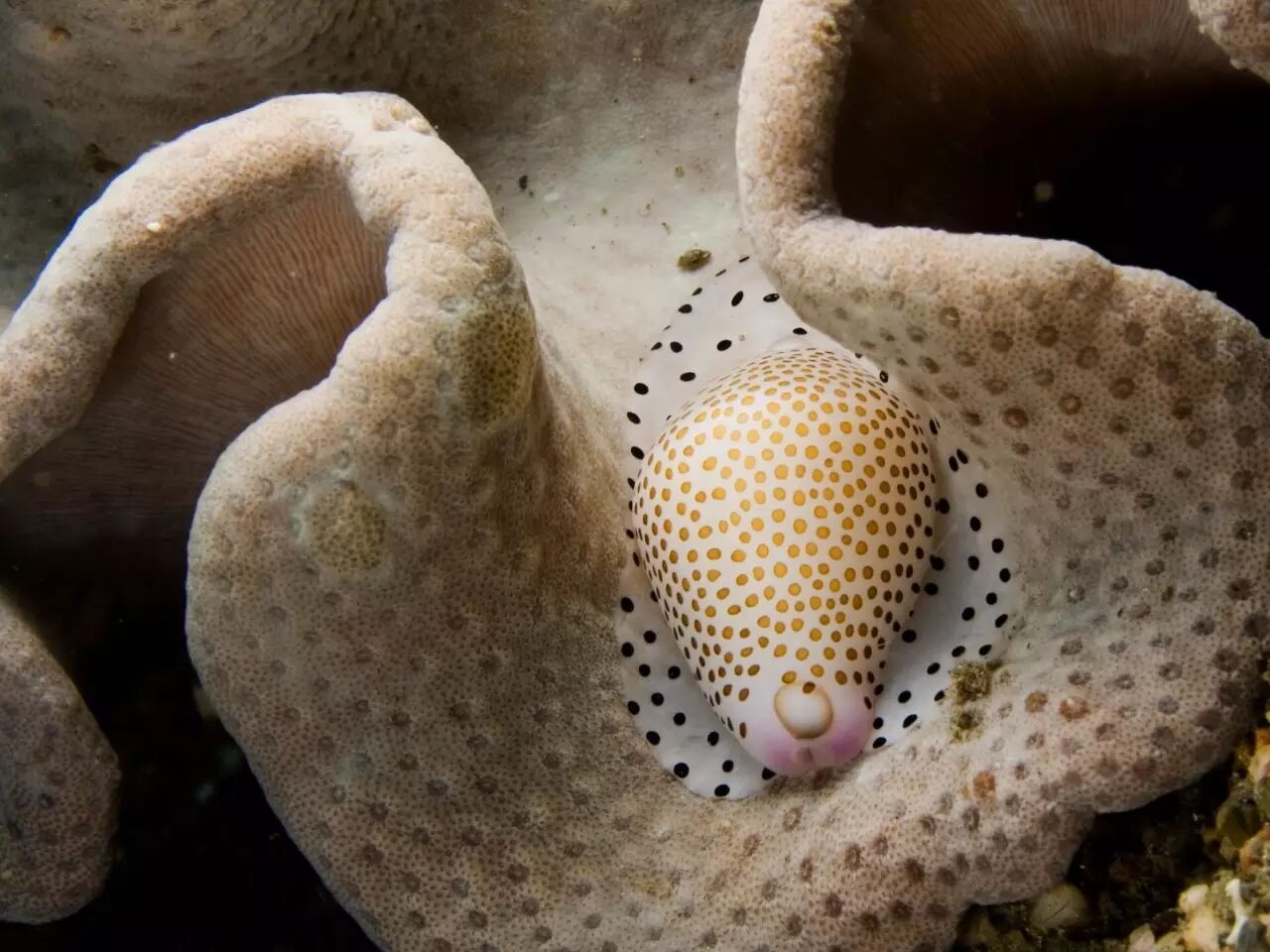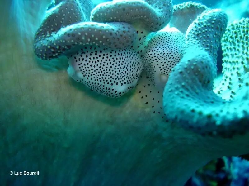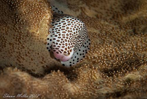 作为宝贝总科的一员,玉兔螺当然也不会例外,它们的配色是对所寄生的“皮革珊瑚”(Sarcophyton spp.或Lobophytum spp.)的拟态。玉兔螺用来包裹贝壳的外套膜颜色纯白,上面布满褐色的小圆斑;伸出壳口的宽大腹足也依照着外套膜的颜色样式。这样的搭配,是否让你想起了另一位珊瑚丛波点“艺术家”——粒突箱鲀呢?<不记得是谁?戳这里看看>