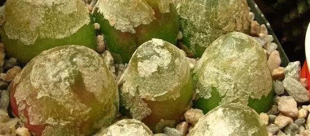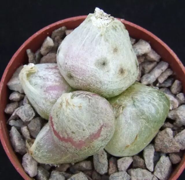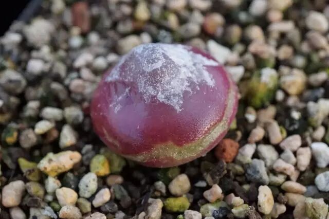当然,和虹之玉<戳这里>一样,灯泡也不可能一年四季都如此萌萌哒。和其他种类的肉锥花“夏休冬醒”生长行为不同,灯泡在一般春夏两季生长,冬季休眠(要注意,极端高温和低温天气,不论冬夏,灯泡都会休眠),休眠期的灯泡被一层薄薄的纸质物包裹着,活像被锡箔纸包着的小笼包,这实际是它们风干的老叶,在原产地,这层“皮”不仅能抵挡一部分毒辣的阳光,还能最大限度防止新生叶的水分蒸发,非常神奇。休眠时如果水分过多,灯泡植株会腐烂,这时几乎不用给水。尽管丑是丑了点,但千万不能手贱,很多人都是好心用错地方,从而造成“烂灯泡”的悲剧。