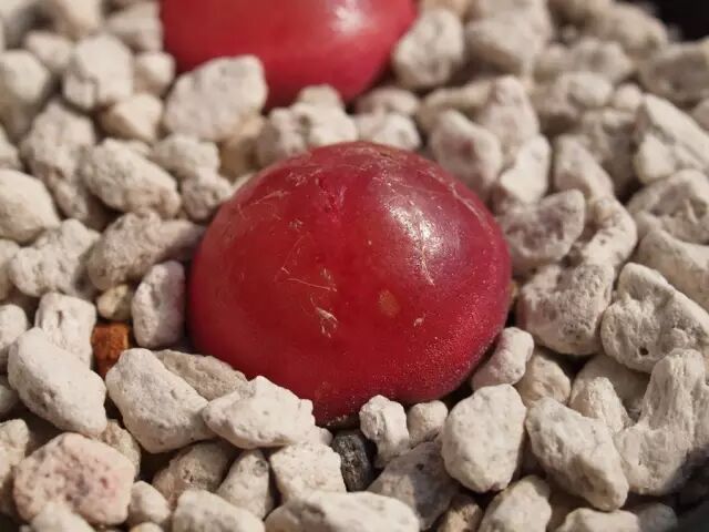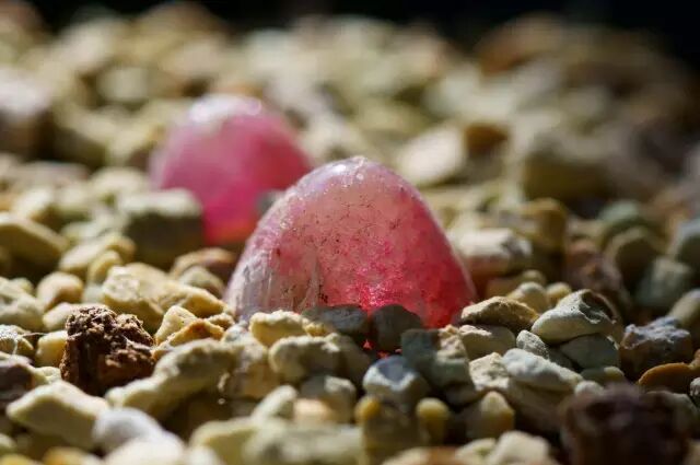 别看灯泡娇滴滴的,就觉得它们从小在优渥条件中长大,其实它们的生存条件可恶劣了。灯泡的原生境是一片贫瘠而荒凉的石英砂砾平原,随处可见白色的水晶和红赭色的黏土,加上阳光毒辣,干旱少雨,对于普通植物简直是炼狱。好在灯泡的肉质叶储存了丰富的水分,而且贴地生长,大部分埋在了黏土里,只露出一小部分进行光合作用,这使得它们能挨受极端天气,同时地表的石英石还会反射一部分阳光,为灯泡们提供一个较为凉爽的庇护所。