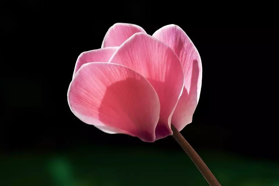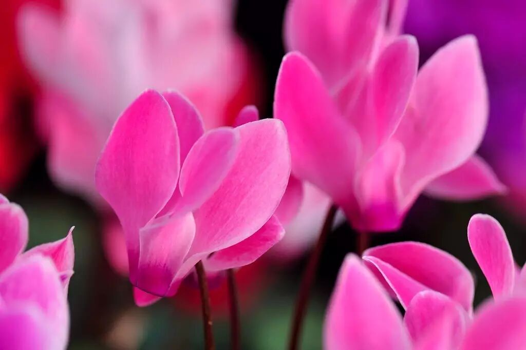 原生的仙客来花瓣是粉红色的,喉部颜色加深,远看像兔子的眼睛一样,经过多年的驯化,现在已经有了几百个不同颜色、花纹和花型的品种。