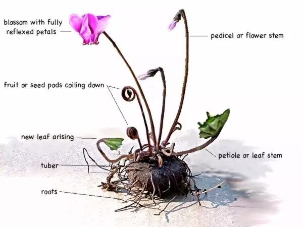 仙客来的花和叶从块茎上方萌发,根从侧面和下方长出来。栽种仙客来块茎时一定要分清楚其上下端,栽反了就算能萌发,株形也会很诡异。区分的方法倒是不难,块茎的顶部会有一些旧花和叶的生长痕迹,把这一面朝上浅浅地埋在基质里就行了。仙客来块茎有一定毒性,人吃了是会拉肚子的,宠物也不要误食。