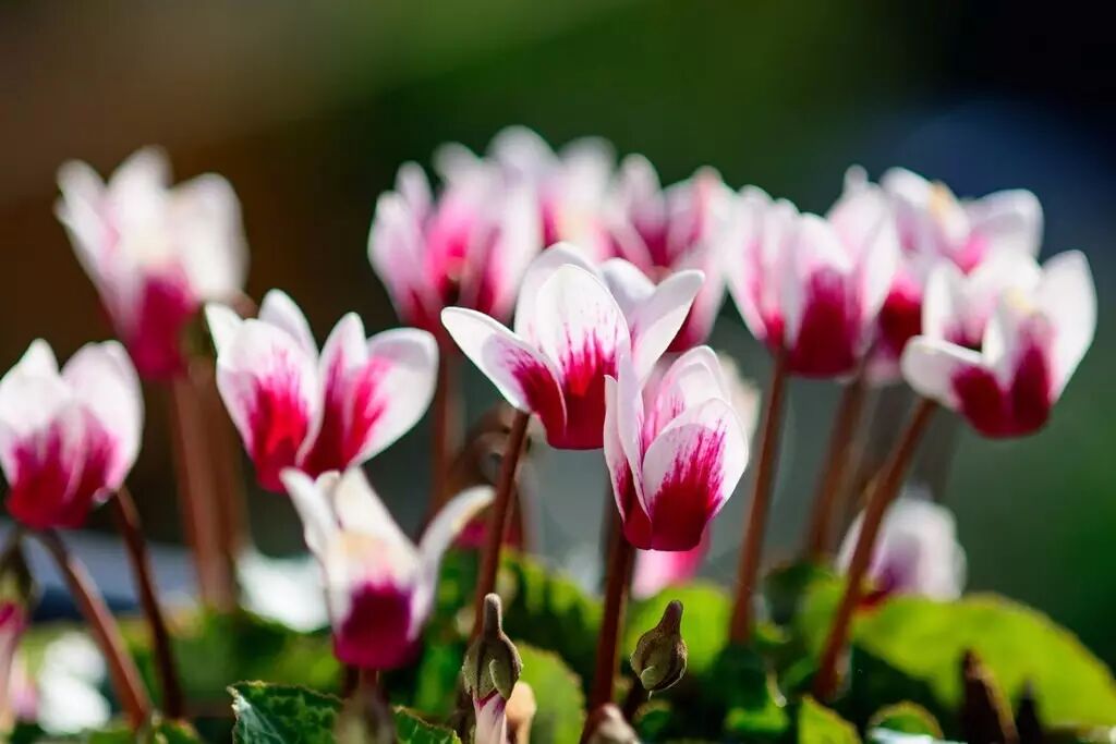 盆栽的仙客来一般是在夏末秋初栽种块茎,基质需要保持湿润但是不能积水,等到它感受到秋天来临的时候就会伸个懒腰,伸出细长的花骨朵。每年开出的第一批花一般都会比较小,随后会越开越大,也越开越多,花期也特别长,能从秋天一直开到来年春天,春节前后正是盛花期。