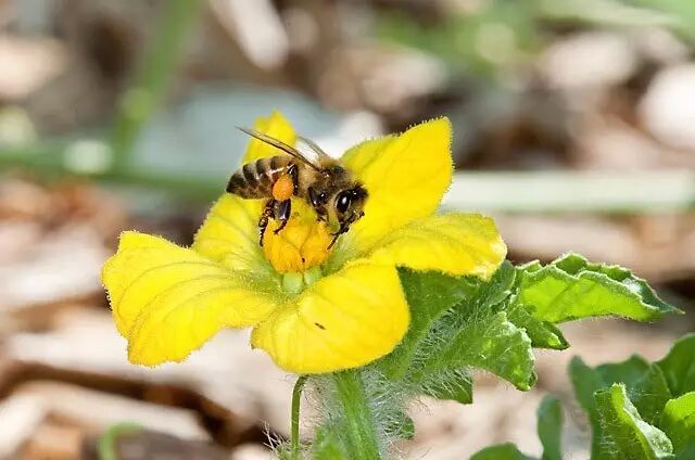 正在给西瓜花朵授粉的蜜蜂<扮演了这么久的吃瓜群众,你知道西瓜的祖先是白瓤的吗>。图片:ars.usda.gov