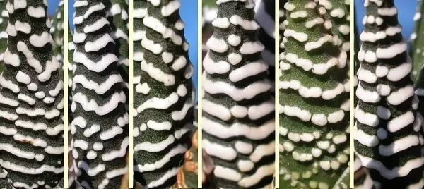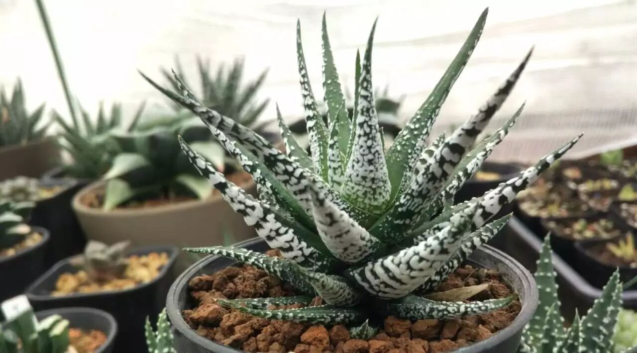 狭义来说,十二卷指的是H. fasciata及其变种和品种,也就是我们常见的条纹十二卷,特征是肉质叶片呈三角状披针形状,叶背上环状镶嵌着突起的白色斑带(圈内术语叫“横缟[gǎo]”),因为叶尖锐利,纹理形象,所以它们在英语里被称为斑马仙人掌(Zebra Cactus)。#前方密恐预警#