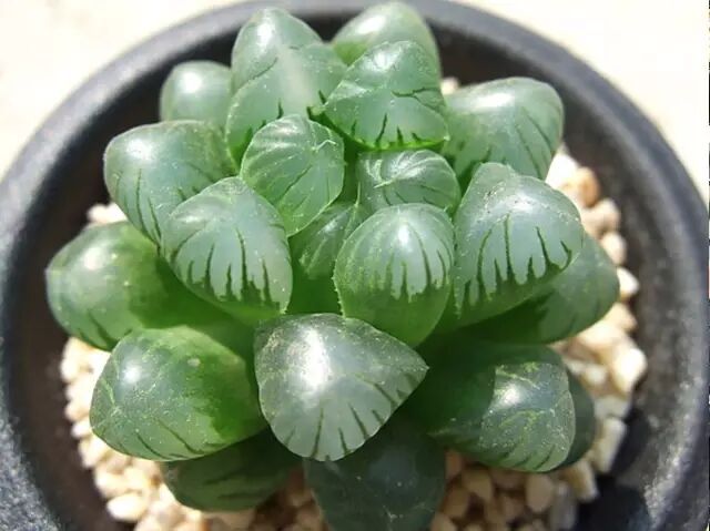 这一种类又叫“截形十二卷”,肉质叶排成两列对生,侧面看像一把折扇,英语则叫马的牙齿(Horse's teeth)。叶片顶部为略呈弧形的窗面,其上也有各种脉纹和疣点,或平滑或粗糙。一颗价值高的玉扇通常叶片排布规整,窗面脉纹美观。绿玉扇H. truncata在市面上最常见,价格也非常亲民;像写乐、鬼岩城、青鸾、玄武等则是玉扇中的贵族,小老百姓买个侧芽玩玩也要因为价格纠结一番。