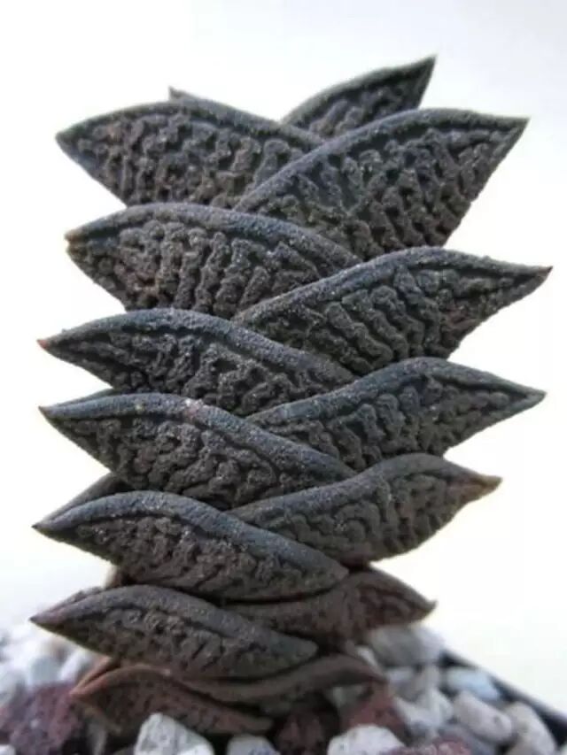 硬叶十二卷观赏点更多是集中在叶片的排布和叶表的纹理疣突上。叶片排布比较猎奇的,如尼古拉H. nigra,日本称为“黑鲛”,它们盔甲一样的叶片交互叠生成塔状,表面还有粗糙斑驳的纹理,整个就像一座矗立在外星荒原上的瞭望塔。因为株型奇特、养护不易,尼古拉一直是很多十二玩家赏玩的珍品。#小心了,前方再次密恐预警#