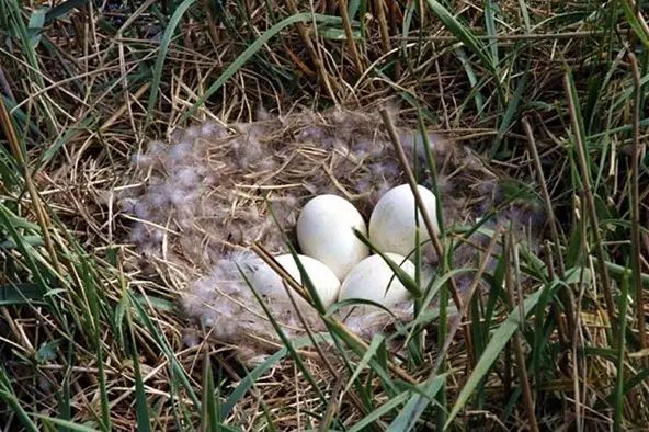 灰雁合群而居,多为一夫一妻制,甚至是终身一侣,雌雄雁共同参与雏鸟的养育。亲鸟们通常在水边草丛间用羽毛、苔藓和杂草筑巢,每窝产卵4~6枚,卵呈乳白色。