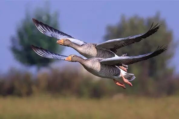 灰雁的飞行能力很强,迁徙时常常几十数百只汇集在一起,互相紧接着列队飞行,古人称之为“雁阵”。整个队伍由有经验的“头雁”带领,加速飞行时,队伍一般排成“人”字形,减速时队伍则由“人”字形换成“一”字长蛇形。雁群低空掠过时的翅膀煽动发出的巨大声响,如果能有幸经历,一定会终生难忘。