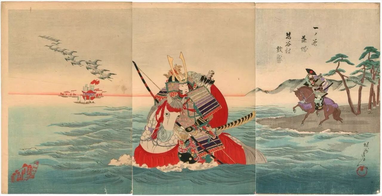 浮世绘《一之谷落城熊谷讨敦盛》,注意他们背上的母衣。图片:bestweb-link.net