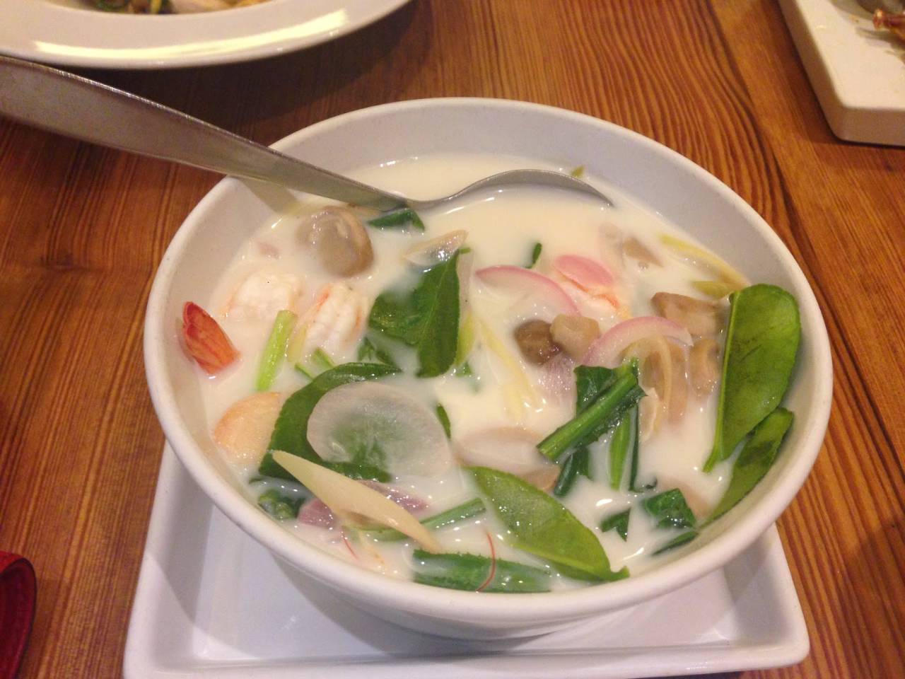 椰奶咖喱汤所用食材和冬阴功汤差不多,可以放虾肉或鸡肉,或干脆不加肉。椰奶咖喱汤的椰香更浓稠,我一旦入口完全停不下来,经常把自己辣得直吐舌头。