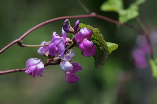 扁豆夏天开花,总状花序上挂着一串串美丽的花朵,一个反折的旗瓣,两个振翅欲飞的翼瓣,一个龙骨瓣,还有独特的(9+1)二强雄蕊(雄蕊9枚与1枚雌蕊合生,包被在龙骨瓣内,另有1枚雄蕊着生在旗瓣上),组成了经典的蝶形花构造。花色一般有紫和白两种,紫色妖娆华贵,白色花高雅素净,如一只只蝴蝶停憩在花梗上,美艳动人。