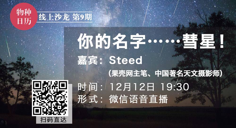物种日历线上沙龙第9期,我们来聊聊这个月的天文(级)大事件,Steed老师主讲《你的名字……彗星!》解答你关于彗星和流星雨的疑惑。现学现用,去看双子座流星雨吧!