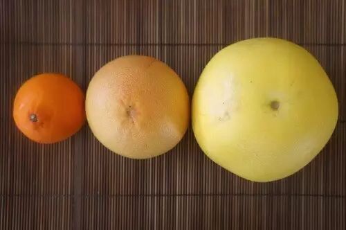 葡萄柚家祖孙三代:橘柚、葡萄柚、柚子(从左到右)。图片:chinesegrandma.com
