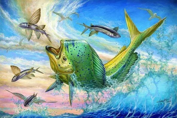 追捕飞鱼的鲯鳅。图片:pinterest.com