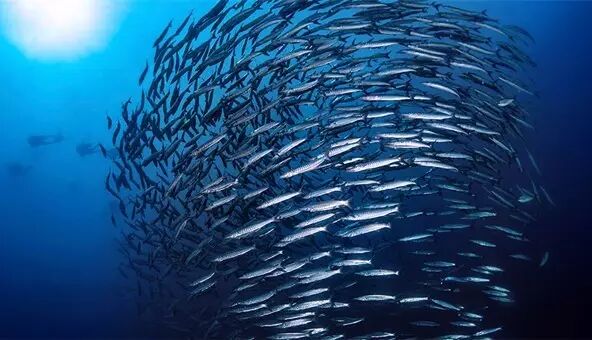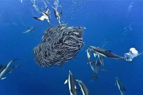 凶猛的海洋猎手也有年少的时候。幼鱼和亚成年的马鲛鱼常常会集结成一个由数万条鱼组成的、巨大而紧凑的鱼群,每个个体都非常精准地保持一个相对稳定的游动速度,来共同抵御敌害。尽管如此,它们还是常常受到海鸟、大型鱼类和海洋哺乳动物的群殴。
