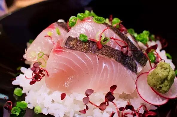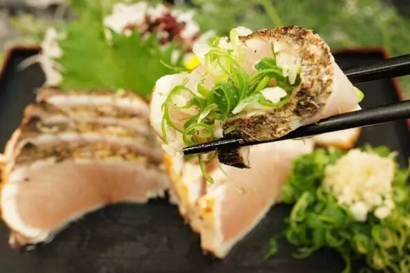将马鲛鱼肉烤至表皮焦黄,但不完全烤透,然后佐以葱、蒜和大酱,再淋上“Ponzu”(一种由柚子汁、酱油、味淋混合而成的调制醋)一起食用。此时,鱼肉蛋白加热变性呈现微微的橙色,油脂缓缓溢出更增加了鱼肉的鲜香。