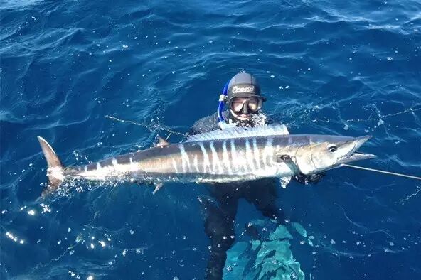 沙氏刺鲅又名竹节䲠,全球三大热带、亚热带海域都有分布,体态优美,背部泛着彩虹般的色泽,体侧有多条深蓝色纵带,它们是身长可达250cm的凶猛猎手。