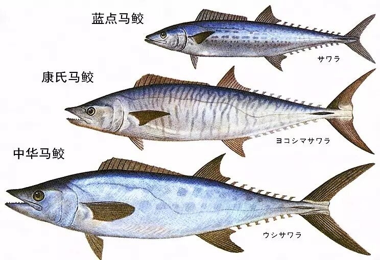 斑点马鲛又称台湾䲠、白腹仔,体型略小,只有约80cm。朝鲜马鲛别名高丽䲠或平䲠,体型略短,腹部较宽,体长约150cm。中华马鲛能长到很大,最长可达250cm,又称为牛䲠,主要特征是它销魂的侧线,沿背侧延伸至第一背鳍后部急降至腹侧,再呈波浪状伸达尾鳍基。