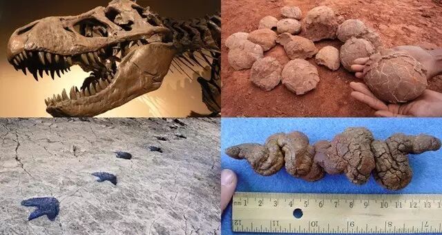 恐龙相关化石,包括:恐龙骨骼(左上)、恐龙脚印(左下)、恐龙蛋(右上)以及恐龙粪便(右下)。图片:wiki commons/shutterstock/Xu Chaoyang/Glen Kuban