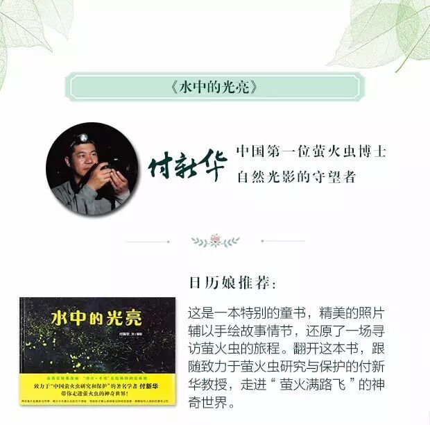 在多年积淀过后,他写作出版了《水中的光亮》一书。这是一本国内比较少见的原创摄影绘本,采用摄影穿插插图的形式,内文主要是自然科学教育。此书取材非常独特,通过孩子和爸爸一起去寻萤,介绍了萤火虫的一生,通过和大自然的亲密接触,传递给小朋友对大自然的爱,并以萤火虫的光亮象征孩子美好的未来。这本书是他希望将萤火虫的知识普及给小朋友的努力之作,故事来自他的亲身经历,保证了本书的科学性,并富有真情实感。