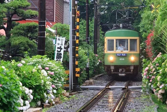 紫阳花海中的江之岛电车。图片:ブログトップ