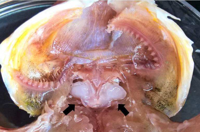 黑色箭头所指为石首鱼科鱼类都有的两个耳石。鱼类的耳石和它们的平衡有关。图片:浪里小海豚