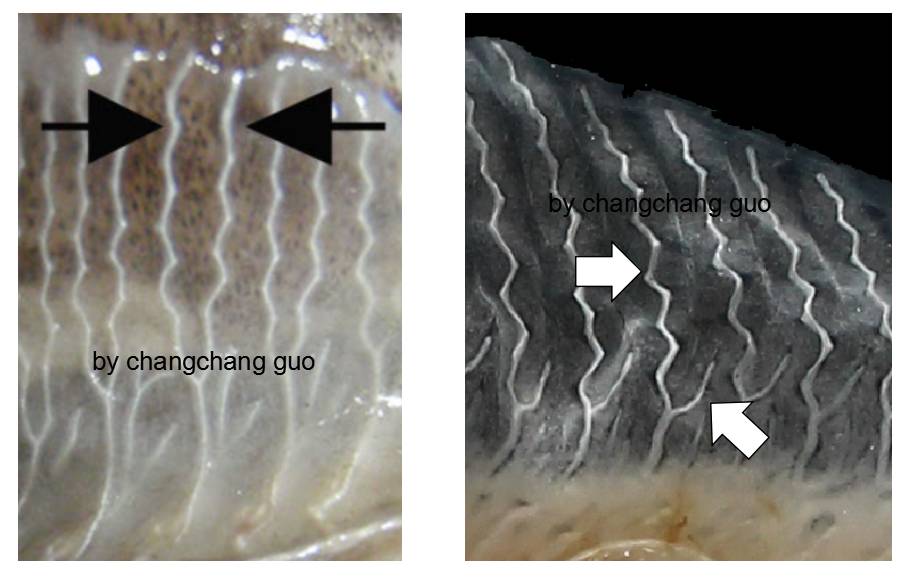 大黄鱼(左)鳔的腹分支的前后小支等长延伸;小黄鱼(右)鳔的腹分支的前后小支不等长延伸,后小支短小。照片:@cc guo