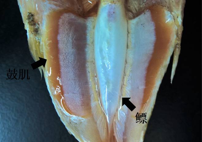 冰箱里木有大黄鱼,只能解剖一条石首鱼科叫姑鱼属Johnius的鱼来充数了。鲜红的鼓肌长在鱼腹部两侧,被白色的膜覆盖。图片:浪里小海豚