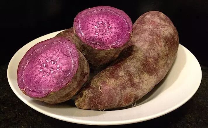 特别需要指出的是,参薯还有一个特别的身份就是香芋。对!就是那个香芋冰激凌中的香芋。紫色的内心,特殊的香气成就了特别的香芋味儿糕点。千万不要把参薯香芋归入芋头家,人家可是薯蓣家的成员呢。(香芋是很多植物的俗名,南方栽培的大魁芋也可能叫香芋,忘了<戳这里>。)