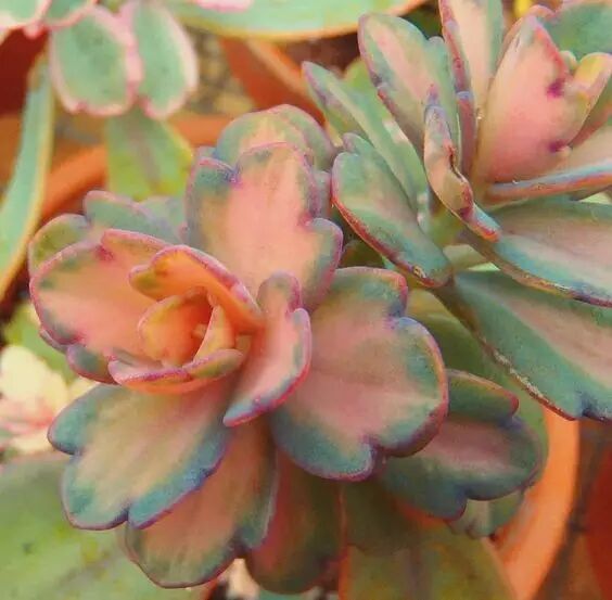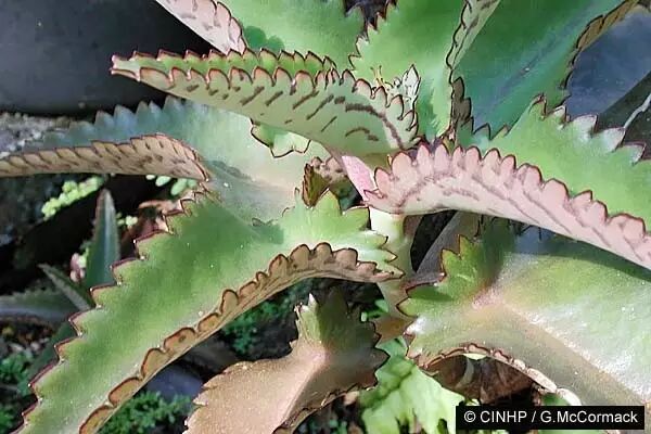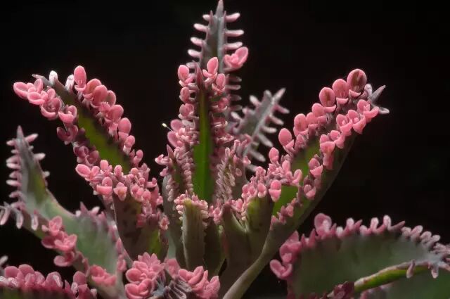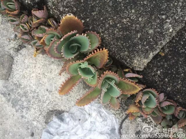 不死鸟,又叫落地生根,为啥?很简单,因为这类多肉通常具有边缘带锯齿的叶片,在锯齿凹陷出会长出不定芽,数量可不是一个两个,而是密密麻麻地占据了整个叶缘,看起来很密恐。小芽和叶缘结合的不是很紧密,很容易掉落,有个恶趣味就是用手撸掉一整片小芽,感觉很爽。掉落的小芽遇到稍微不错点的环境(阳台,沟渠),就能迅速生根发育。