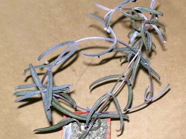 叶片是三角形的,比前面两种都来的窄,所以叫窄叶不死鸟(还有一种类似K. daigremontianum,叶片更小,正背面都有豹纹)。这种不死鸟叶片正面绿色,背面灰色,有紫色的豹纹分布,也挺漂亮的。