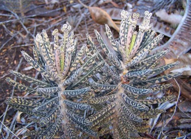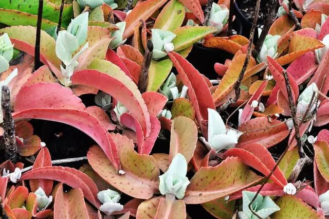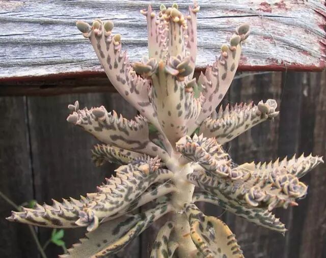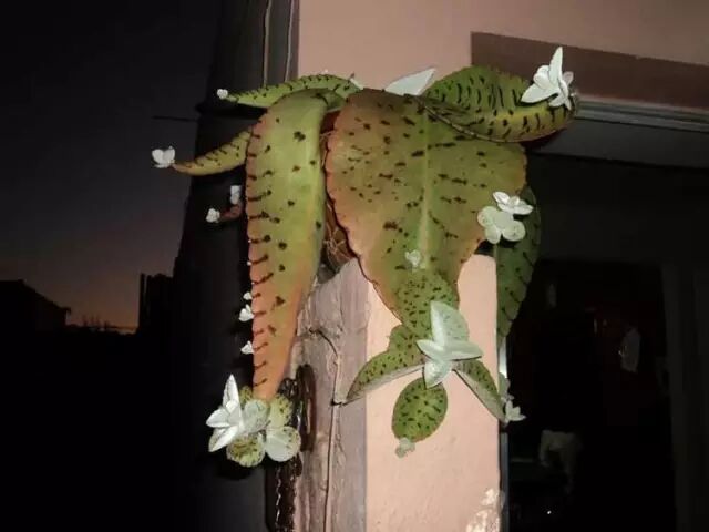 又叫棒叶不死鸟。锦蝶是最好辨认的了,叶片是棒状的,只有顶端有锯齿,所以小芽都集中在顶部。叶片还有狂野的黑色豹纹。锦蝶一般可以长到2米高,开花红艳艳的,很让人惊艳。