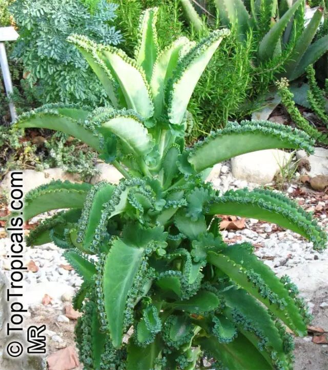 几乎是叶片最大的一种不死鸟了,长到一两米高也不是问题,三角状的叶片单叶对生,碧绿色,上面没有斑纹,边缘细锯齿,密生不定芽,颜值不高,最遭嫌弃。