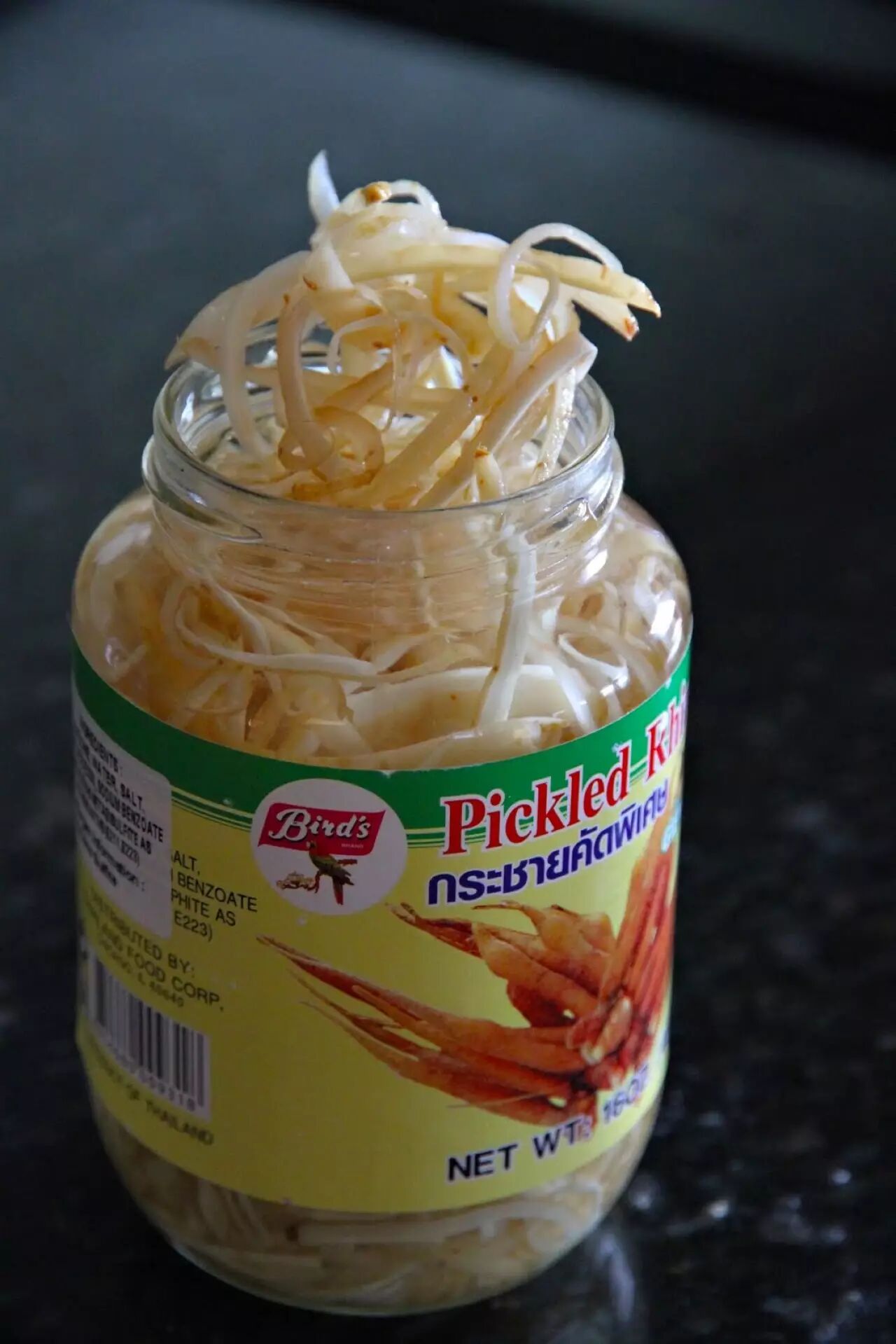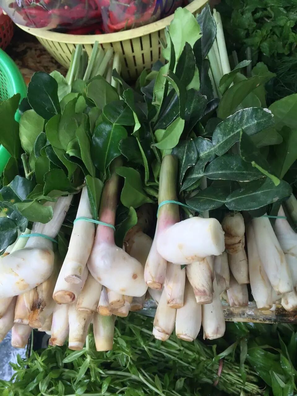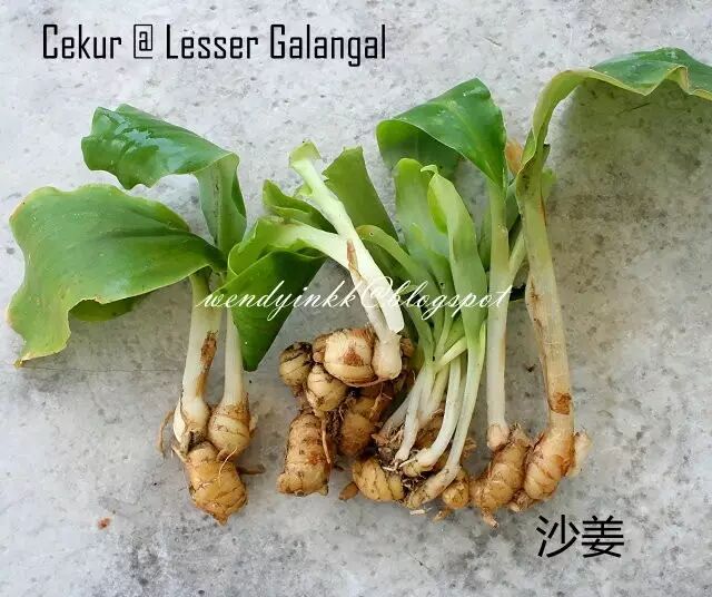 凹唇姜Boesenbergia rotunda,又叫泰国沙姜,在东南亚被叫成Krachai 。它们的地下根茎形状尤其特殊,类似手指,所以英语称之为指根(finger root),尝之有一股泥土和胡椒混合的味道,较为温和,一般被切丝制成爽脆的酱菜吃。