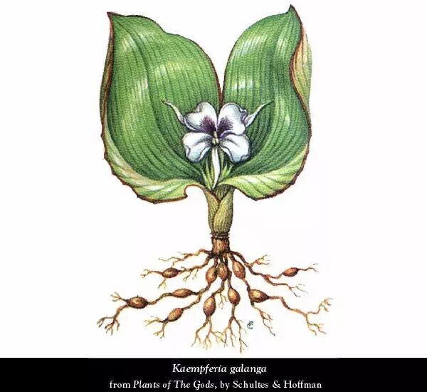山柰花色洁白,有两块紫斑点缀着,也算是小巧秀气。不过它有一位亲戚——紫花山柰K. elegans,花色是明艳的紫色,宽大的叶片表面有着紫黑色的斑纹,如同水墨泼画一样的漂亮。由于颜值高,紫花山柰被当成观赏植物,从而逃离了被吃掉的命运(燃鹅,本来就没有吃它们的记载呀)。