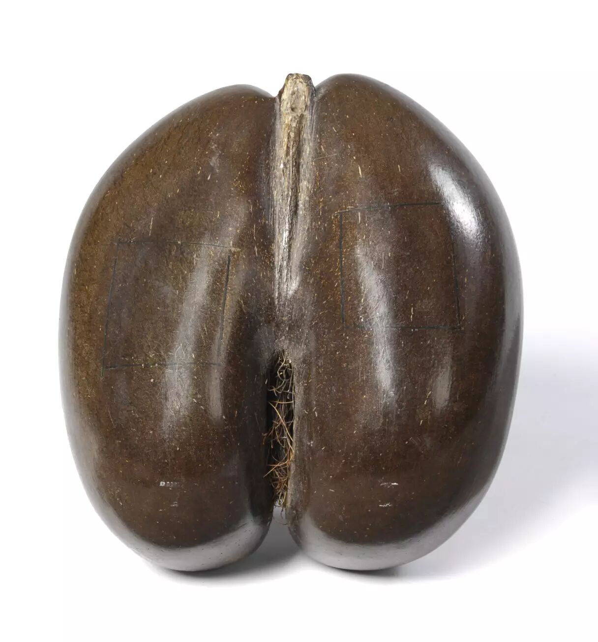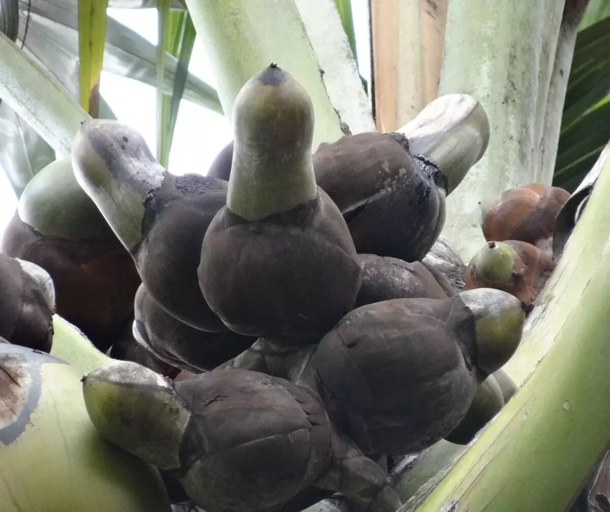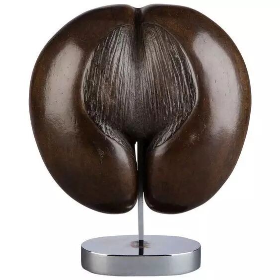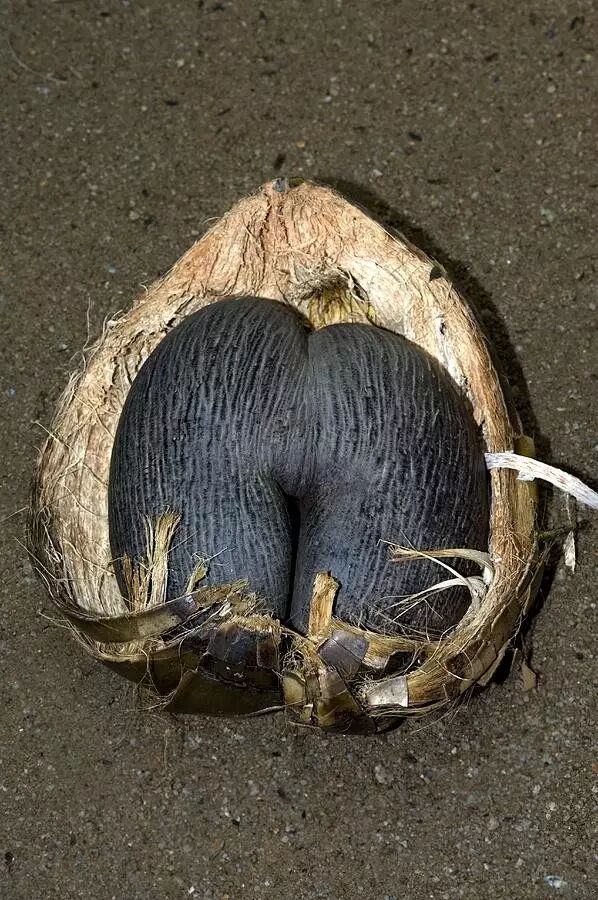 海椰子的果实就像是两个青涩的椰子拼合在一起,所以有了双椰子或者复椰子的小名。当然,这并不是这种植物的重点,重点在于剥去那层像椰子的、果皮一样的结构之后,海椰子种子的“真正实力”就展现出来了。从人类的角度看,这深棕色的种子与人类女性身体从肚脐眼以下到大腿根以上的部分极其相似。